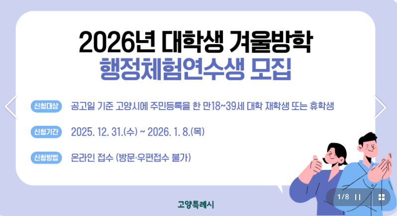 2026년 대학생 겨울방학 행정체험연수생 모집
