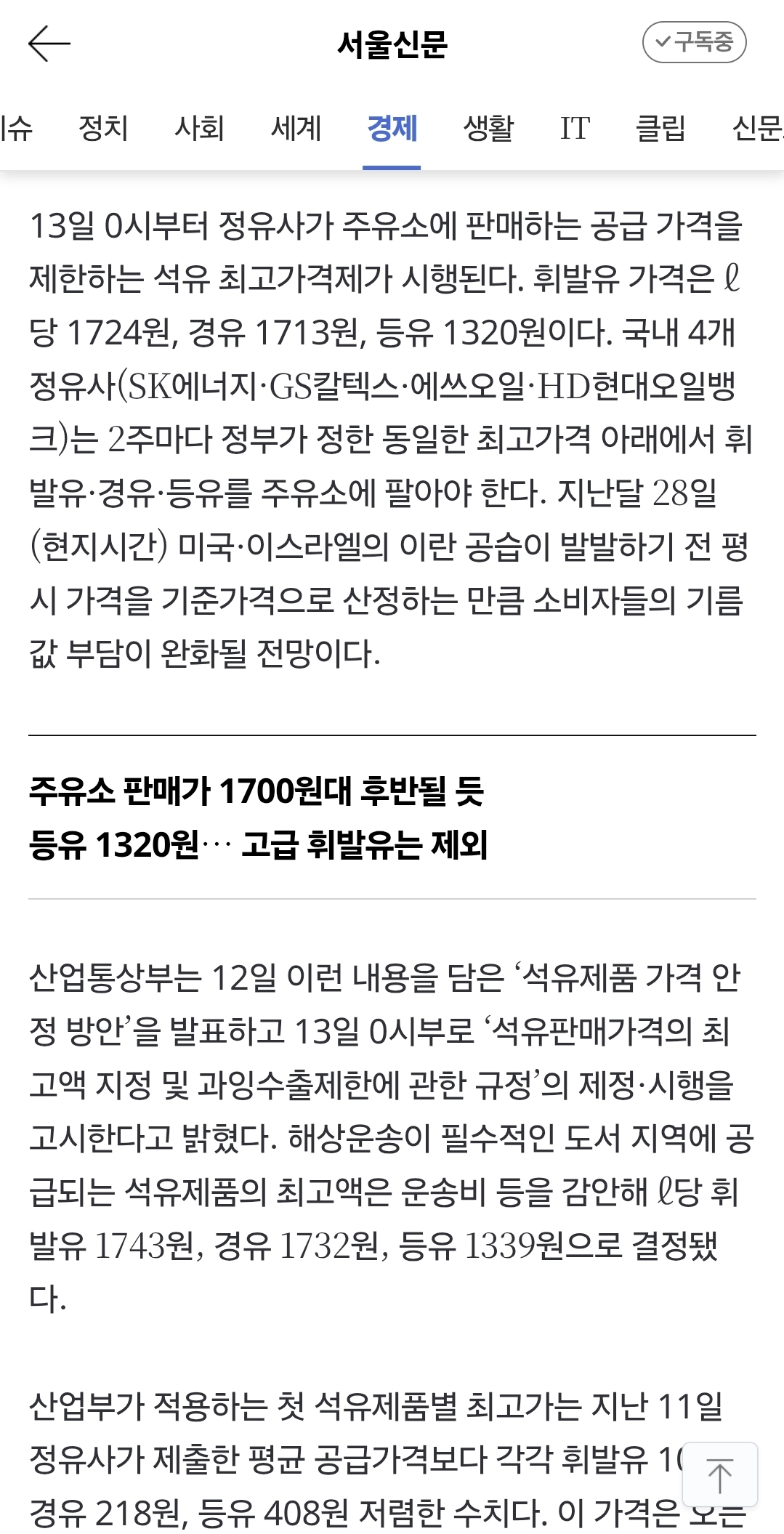 석유 최고가격제 시행, 기름값 안정 되나. . 주유소 기름값 1700원 후반..