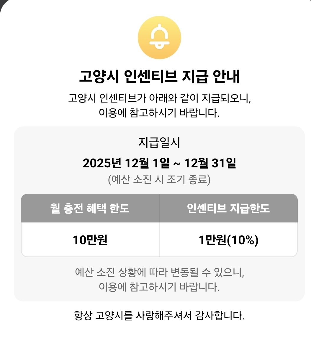 고양페이 충천하면 인세티브 10% 지급된다합니다 충전혜택한도 10만원에 만원 이라하..