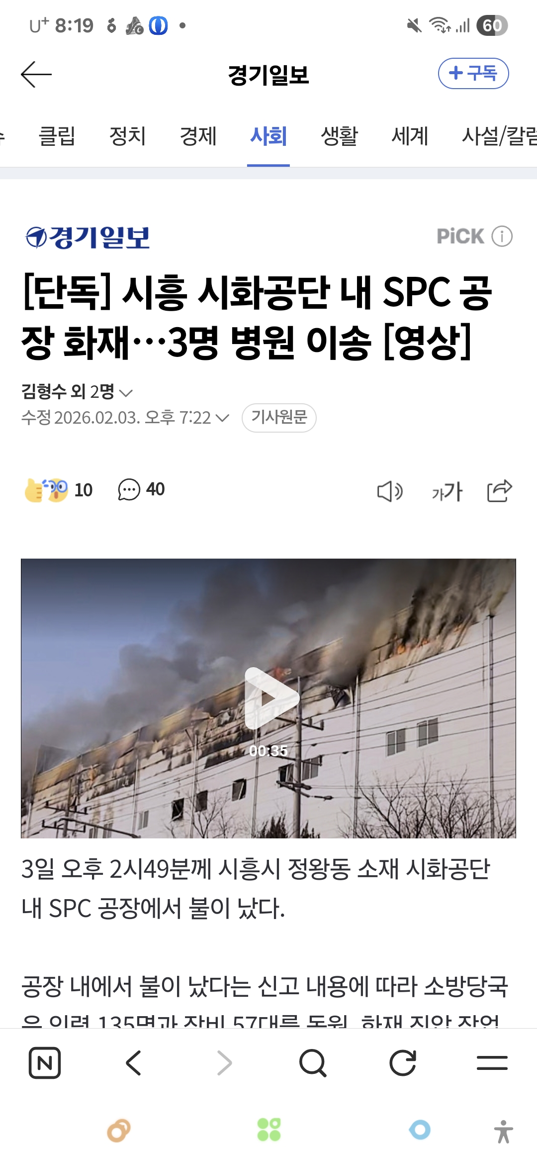 어머 시흥 SPC 삼립 공장 화재네요 ㅜㅜ