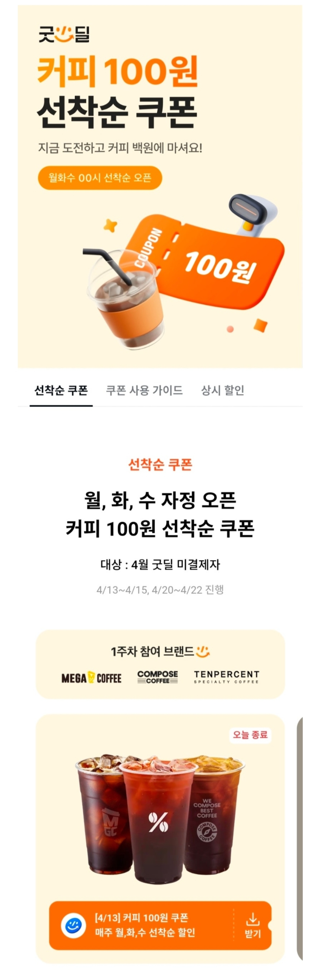 티데이 컴포즈커피 아메리카노(HOT) 못받으신분들 추가로 쿠폰 받으실 수 있어요! 어..